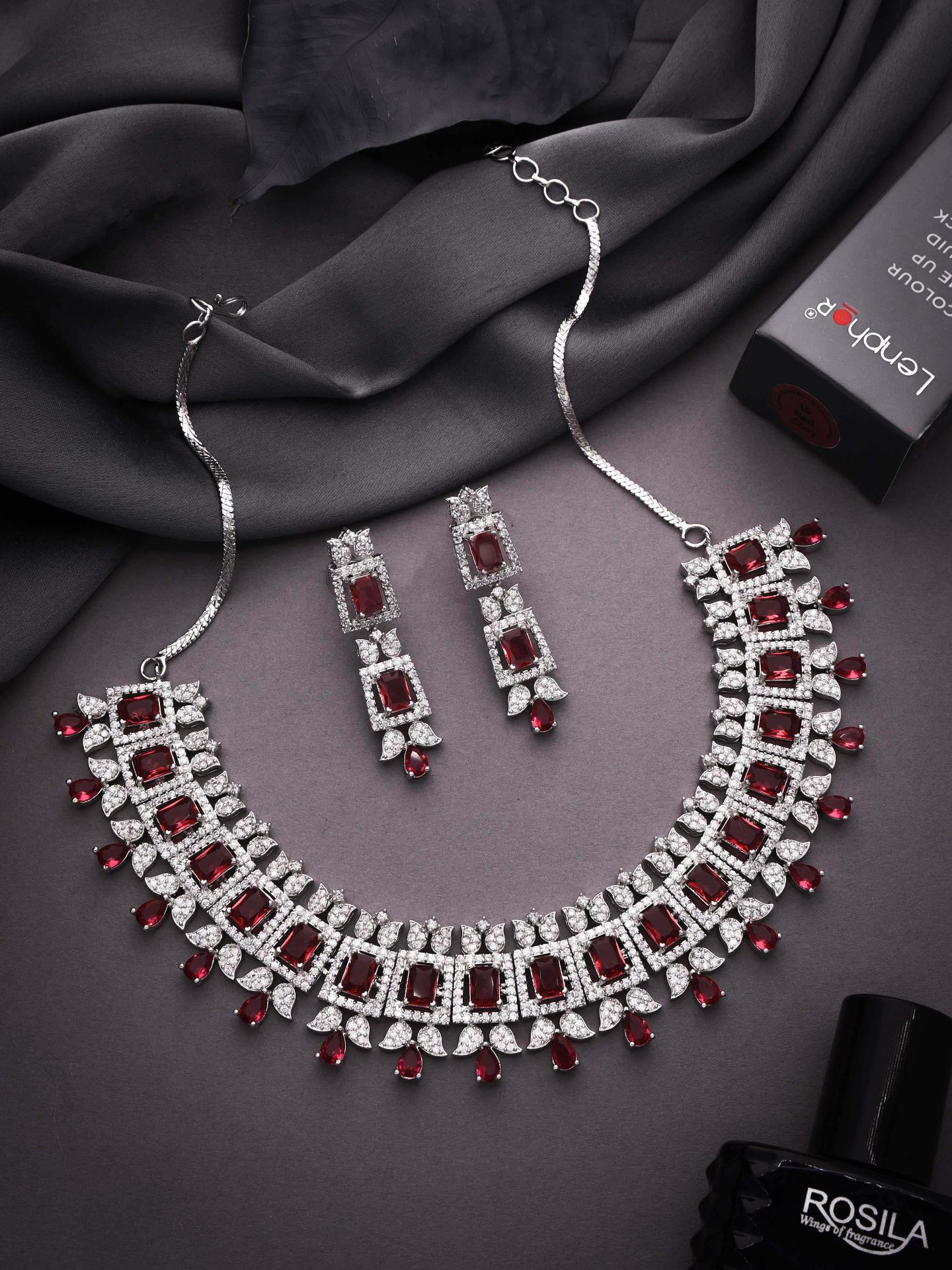 Silver Polish White & Maroon AD Studded Necklace Set